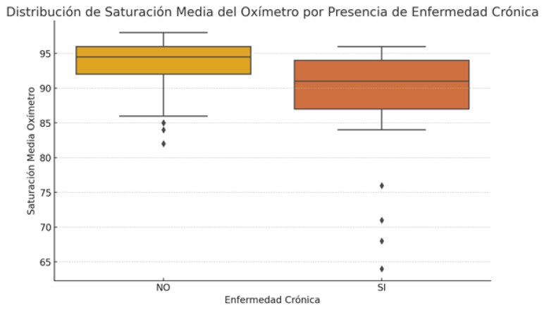 En la figura 1 se observa que el grupo sin enfermedad crónica tiene una mediana alrededor de 95%, con una menor dispersión en los valores de saturación, con valores atípicos por debajo del 85%. El grupo con enfermedad crónica presenta una mediana más baja, cercana a 93%, y una mayor dispersión en los valores de saturación con valores atípicos por debajo de 70%.