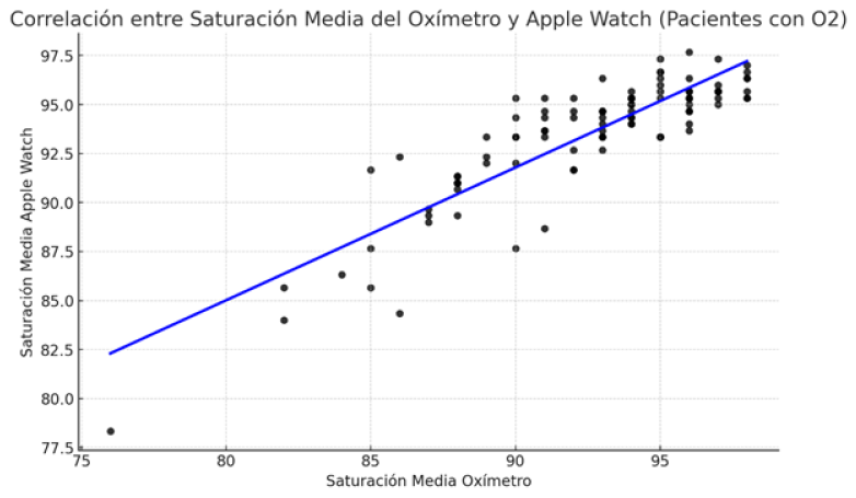 Diagrama de dispersión que muestra la correlación entre la saturación media de oxígeno registrada con el oxímetro de pulso Masimo SET® y el dispositivo Apple Watch Ultra®, en pacientes con uso de oxígeno suplementario. Fuente: Elaboración propia.