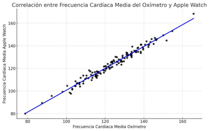 La media de SpO2 fue 92,97 ± 5% (oxímetro) y 93,52 ± 4,2% (Apple Watch Ultra®). El CCC para SpO2 fue 0,88, mostrando una alta concordancia, y la correlación de Spearman fue 0,811. La media de FC fue 123,7 lpm (oxímetro) y 123,63 lpm (Apple Watch Ultra®). El CCC para FC fue 0,99, con una correlación de Pearson de 0,986.