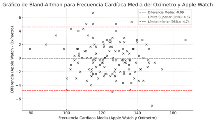 Para FC, la diferencia de medias fue -0,09, con límites de concordancia entre -4,74 y 4,57 lpm. En el caso de la SpO2, la diferencia media fue de 0,97, con límites entre -3,44 y 5,38.
