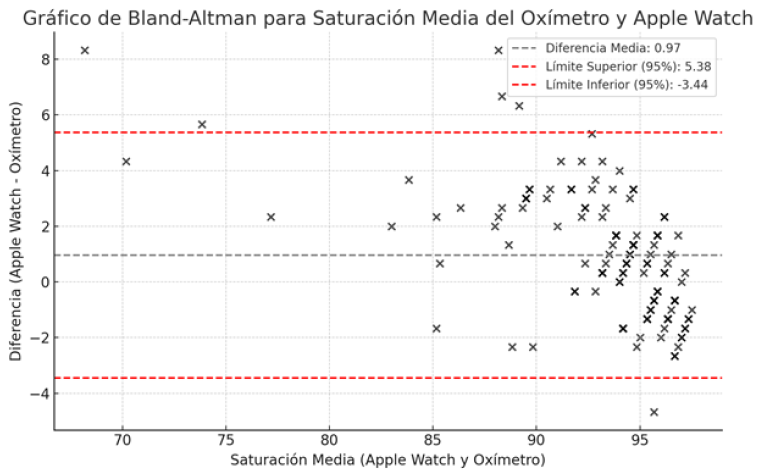 En esta figura, la diferencia media de saturación media de oxígeno obtenida de oxímetro y Apple Watch Ultra® es de 0,97, lo que indica que, en promedio, las mediciones del Apple Watch Ultra® son ligeramente superiores a las del oxímetro. Los límites de acuerdo al 95% (entre 5,38 y -3,44) reflejan el rango en el que se encuentran la mayoría de las diferencias (IC del límite superior: 4,34 - 4,80 e IC del límite inferior: -5,00 - -4,47).