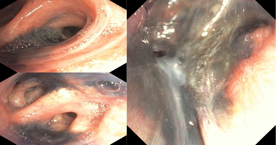 Fotos tomadas de broncoscopias. Imagen A: Mucosa de segmentos bronquiales con manchas antracóticas. Imagen B: Mucosa de segmentos bronquiales con manchas antracóticas y distorsión. Imagen C: Mucosa de segmentos bronquiales con manchas antracóticas, distorsión y estenosis (antracoestenosis).