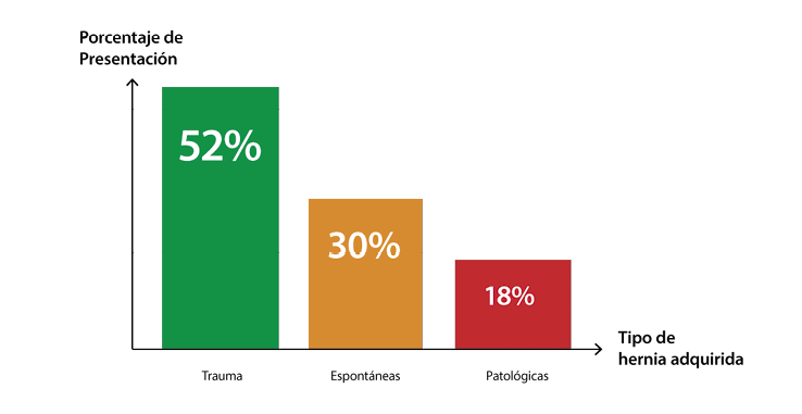 El trauma es la causa de hernias pulmonares adquiridas más frecuente. Sin embargo, continúa siendo una entidad poco frecuente en general, con pocos reportes en la literatura, por lo que su incidencia y prevalencia exacta todavía es desconocida.8 Se han registrado aproximadamente 300 casos desde su primera descripción en 1499.9