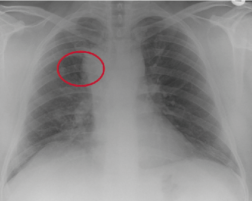 Signos radiológicos de la hernia pulmonar. La radiografía muestra una lesión mediastinal en el ángulo traqueobronquial derecho. “Lucent lung” sing.